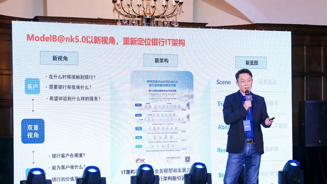 演讲最后,戴可分享了金融机构数字化评估体系。他指出,当前银行存在缺乏统一建设标准和架构的痛点,神州信息以基于ModelB@nk5.0架构的200余个评估体系指标,实现了核心技术、场景应用、经营管理等多个维度的覆盖,助力银行数字化转型,成为金融行业最值得信赖的合作伙伴。
